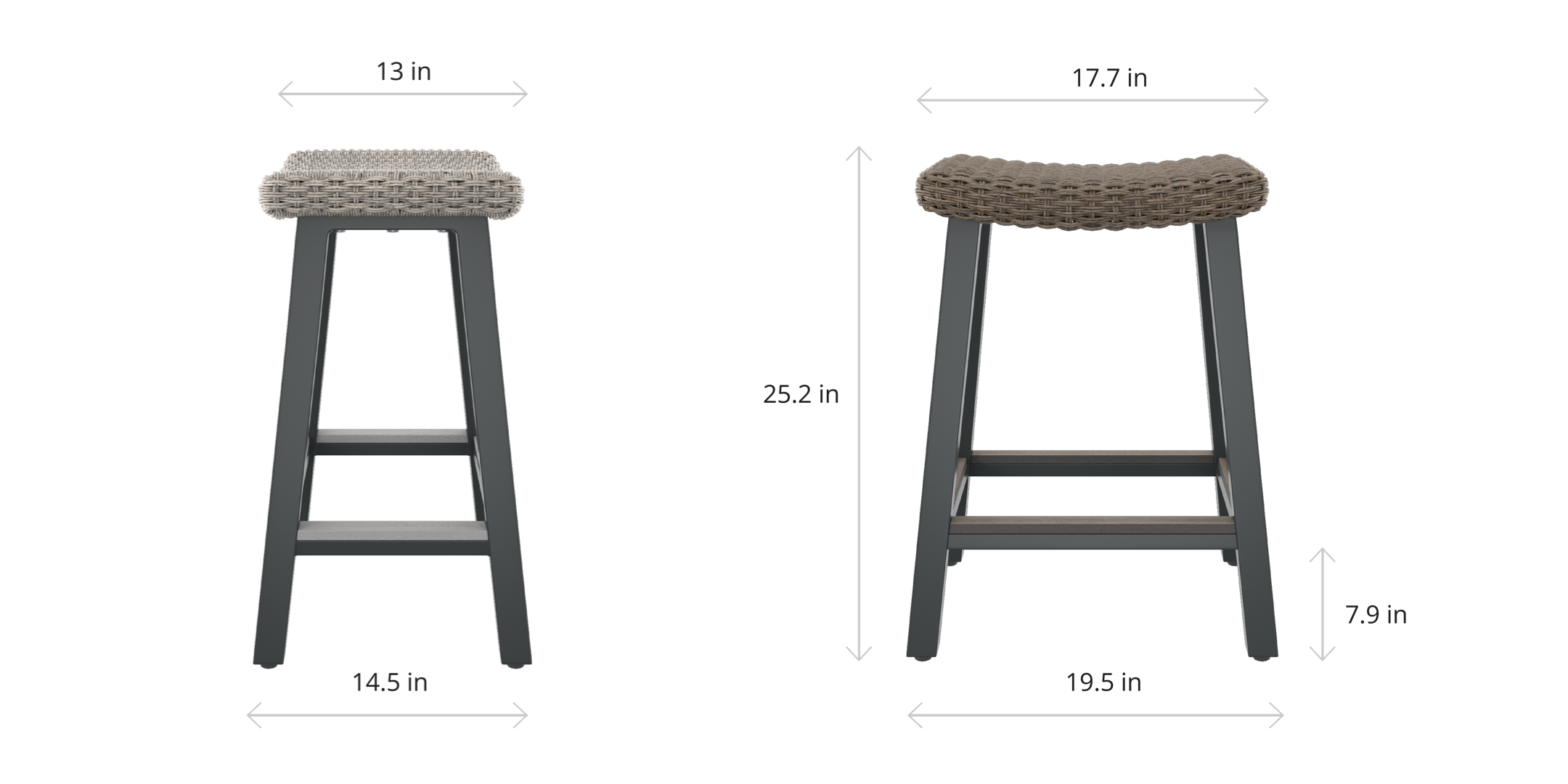 - DIMENSIONS & SIZING: Each chair measures 19.5"L (at longest) x 14.5"W (at widest) x 25.5"H. Seats measure 17.7"L x 13"W.