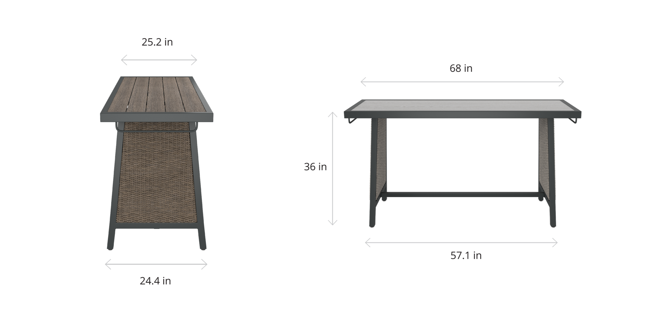 - DIMENSIONS & SIZING: Table base measures 57.1"L x 24.4"W x 36"H (including tabletop). Tabletop measures 68"L x 25.2"W.