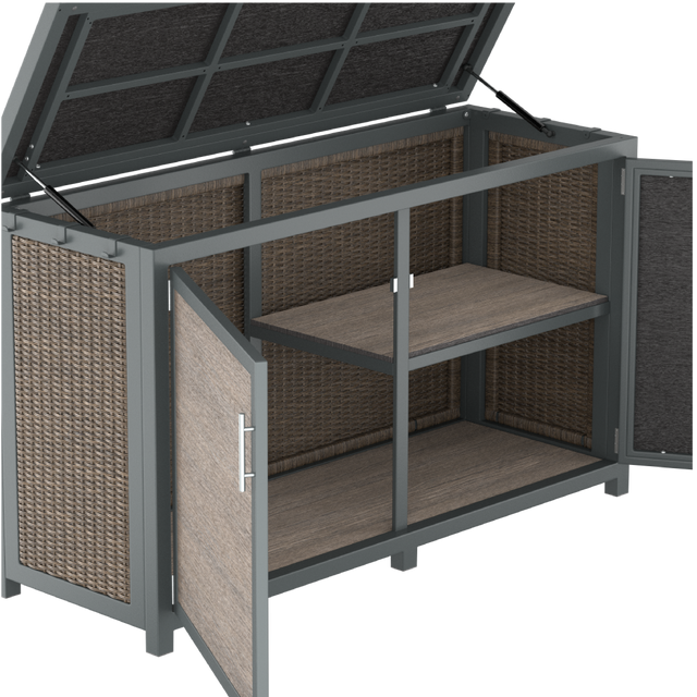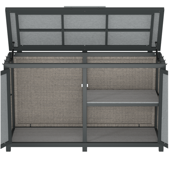 - OUTDOOR DECK BOX: Top and front openings with 2-tier shelving on inner half.